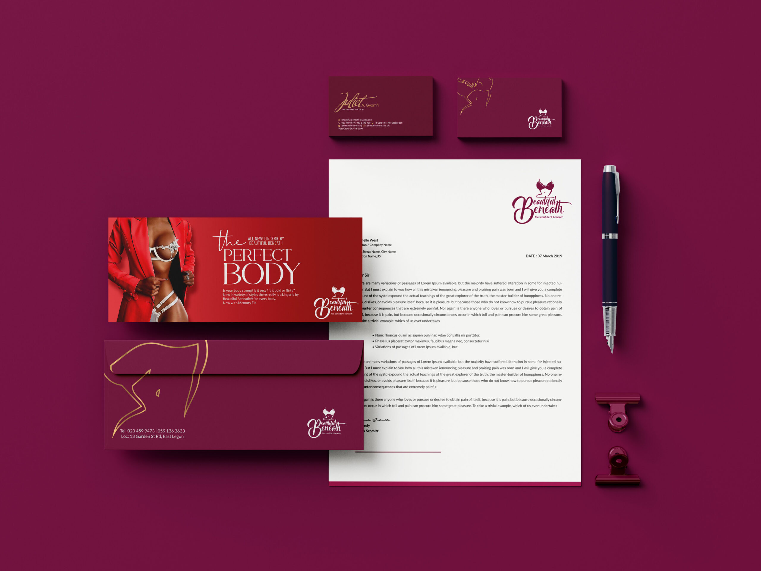 We have always believed in a humble philosophy that sometimes we don’t need to be elaborate; just a simple idea can have great impact. This philosophy is seen in the logo designed for Beautiful Beneath. We simply used a bra to represent the business of lingerie sale and retailing. For the text, we used a font which flows elegantly while looking sleek and modern. The result is an identity that stays true to the brand and appeals to its target group.